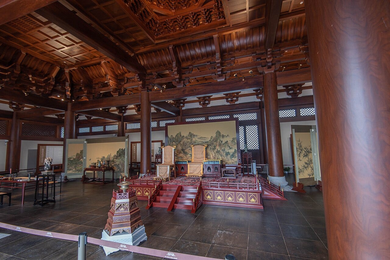 现代复原的宋高宗德寿宫重华殿内景。图片来源:https://zh.wikipedia.org/zh-cn/%E5%BE%B7%E5%AF%BF%E5%AE%AB%E9%81%97%E5%9D%80#/media/File:%E5%BE%B7%E5%AF%BF%E5%AE%AB%E5%8D%9A%E7%89%A9%E9%A6%86,_2023-09-26_08.jpg